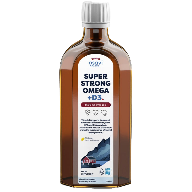 • The Osavi Super Strong Omega + D3 3500mg Omega 3 (Lemon) is a premium liquid food supplement derived from sustainably sourced wild pelagic fish, primarily anchovies. Each serving is packed with vital unsaturated fatty acids—DHA and EPA—delivering them in the highly absorbable triglyceride form, along with vitamin D, essential for your health.