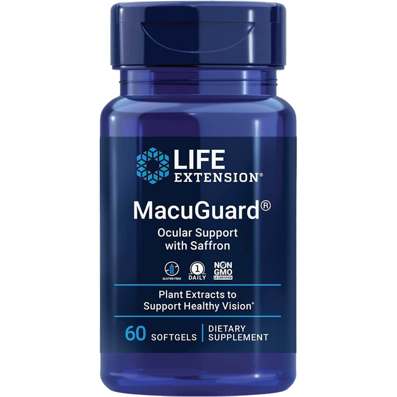 - Non-GMO. This unique blend harnesses the benefits of phospholipids for better lutein absorption. Life Extension MacuGuard Ocular Support is designed to uphold your eye health and enhance night vision. It delivers lutein, trans-zeaxanthin, and meso-zeaxanthin, which are vital nutrients that safeguard the sensitive photoreceptor cells in the retina's macula against light-induced damage. Additionally, the formula includes C3G (cyanidin-3-glucoside), a modern berry flavonoid that supports the regeneration of rhodopsin, a vital compound for light absorption in the retina, thereby promoting optimal night vision.Life ExtensionMacuGuard Ocular Support with Saffron - 60 softgelsFood supplement in softgels. Containing extractsNutrition FactsServing Size:1 SoftgelServings Per Container:60Amount